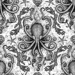Octopus Damask Wallpaper - Black & White - Victorian Antique Steampunk Kraken
