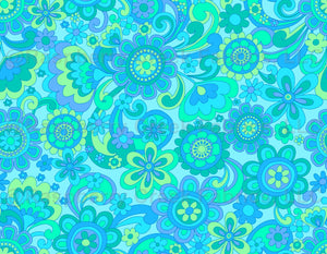 A fun groovy 60s/70s inspired design of flowers and swirls.
