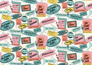 Right this way to the 1950s soda fountain where you can get a milkshake seven days a week or an ice cream soda for only 10¢. This fun retro themed design is sure to make anyone smile with all the various 1950s style signs to lead you to the soda fountain.