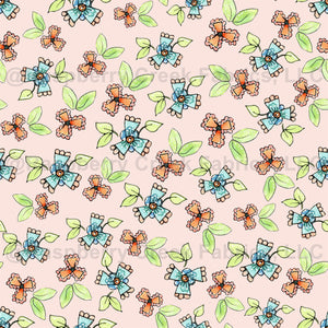 3 petal flower Posy in turquoise blue and red hand drawn watercolor doodles on pink background
