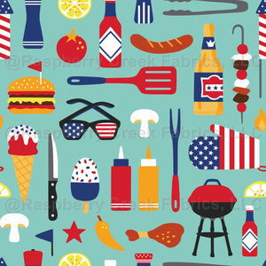 This patterns is inspired on a 4th of July barbecue. It features food, drinks and accessories mainly in blue, red and white.