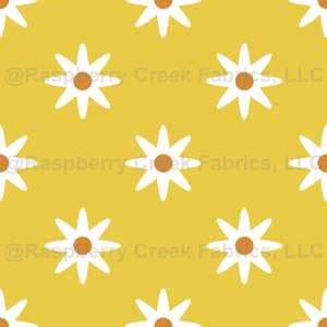'60s cats and chairs design coordinate with stylized white starry flowers shapes on yellow background
