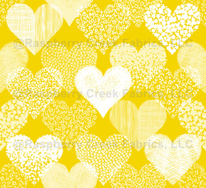 White colored 80's hand-drawn transparent hearts with graphics textures like stripes, dots, crosses, Memphis geometric shapes on a yellow background.