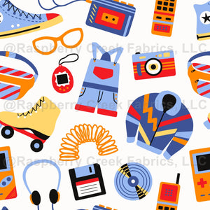 Pattern with 90s and Y2K second hand treasures that you could find on a thrift store like games, sneakers, floppy disks, cassette player, waist packs, phones and clothing. This print is full of gen z icons and can give your clothes a funky nostalgic vibe.