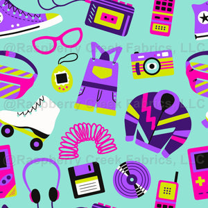 Pattern with 90s and Y2K second hand treasures that you could find on a thrift store like games, sneakers, floppy disks, cassette player, waist packs, phones and clothing. This print is full of gen z icons and can give your clothes a funky nostalgic vibe.
