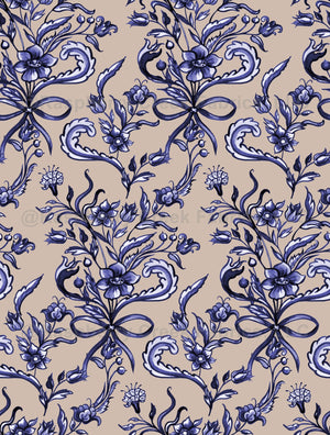 A hand-painted floral pattern inspired by traditional Portuguese azulejos. Delicate blossoms and leafy motifs in traditional blue unfold in buffed beige color background.