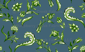 A richly detailed ornamental pattern inspired by classical floral compositions and the decorative spirit of antique azulejos. This design features lush green foliage, blooming flowers, and elegant ribbon-like motifs intertwined in a harmonious vertical repeat. Painted in expressive watercolor technique, this pattern evokes a sense of refined nature and timeless elegance.