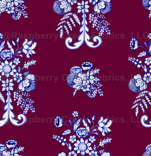 Delicate blossoms, fruits, and leafy motifs unfold in rich cobalt blues on a burgundy background, blending folk-art charm with elegant symmetry.
