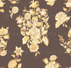 A hand-painted floral pattern inspired by traditional Portuguese azulejos. Delicate blossoms and leafy motifs unfold in rich yellow and coffe quatrz color background.