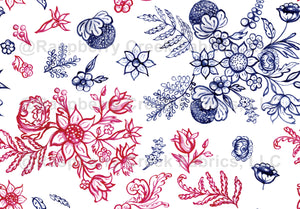 A hand-painted floral pattern inspired by traditional Portuguese azulejos. White on the background with traditional red and blue