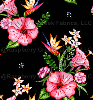Living on Madeira surrounded by lush plants and tile façades sparked this vibrant fusion. Hibiscus, bird of paradise, and frangipani come together in a hand-painted design – perfect for textiles, resort wear, and accessories. Reds colors of flowers wrapped in theblack background to make force vibrant.