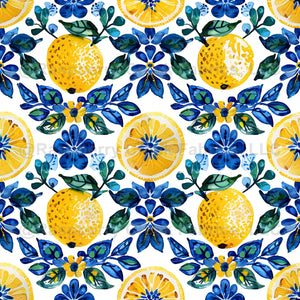 Lemons and indigo florals bloom in a breezy Mediterranean repeat inspired by sunlit Santorini days and fresh coastal living.