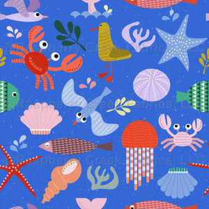 Fun and whimsical. Things you see at the beach and from the beach. Off-white background is also available.