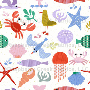 Fun and whimsical. Things you see at the beach and from the beach. Blue background is also available.