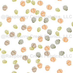 Abstract Confetti Celebration with Hand-Drawn Dots in Earthy Tones of Green Orange and Brown Scattered Across a Bright White Background