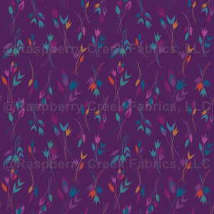 Modern abstract floral motifs in purple, magenta, orange, marigold, and shades of blue and green, scattered on a dark purple background.