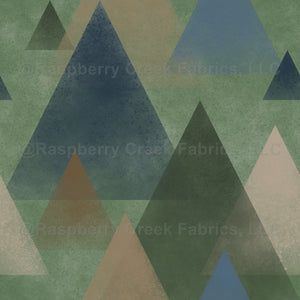 Abstract Misty Mountains, Geometric Triangles, Modern, Pine Green, Slate Blue, Brown, Tan, Beige, Navy