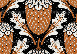 This eye-catching maximalist design features evenly spaced acorns, each adorned with intricate dotted textures that add richness and depth. The bold black and white palette is enhanced by warm rust orange accents, creating a striking contrast that feels both modern and natural. Perfect for statement-making sewing projects, home decor, or accessories with a boho or rustic flair. The repetitive arrangement adds harmony to the lively and detailed elements, making it a versatile choice for creative fabric lovers.