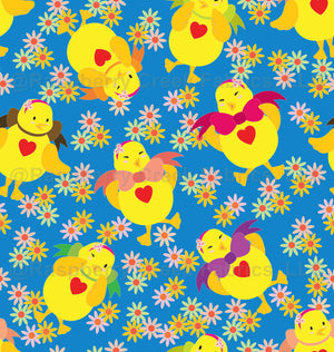 Adorable Baby Chicks with Heart Patches, Flower Crowns, and Bows Scattered Among Daisies on a Bright Blue Background - Perfect for Spring Sewing Projects!