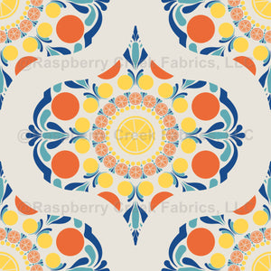 Enjoy retro elegance in our colorful Oranges and Lemons dot mandala in a mid century modern ogee pattern using colors from our Aegean Summer palette.