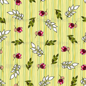 Pink and Green watercolor Floral Ditsy with botanical details, leaves and flower buds on a Green and Yellow Striped background. Coordinate for the Amanda Sketched Watercolor Garden Collection. Vertical, directional, Wallpaper, fabric, home decor