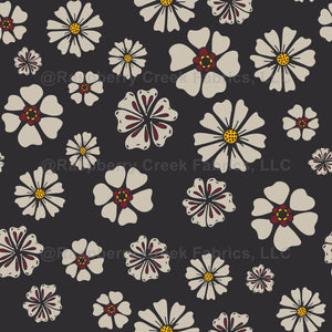 American Folksy Floral Tossed Khaki flowers with Bright Yellow centers on charcoal black background