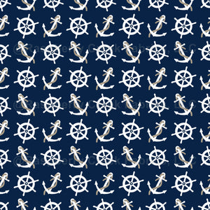 White nautical ship steering wheels and white anchors with beige rope on navy blue. Coordinate for the Nautical Goodness Collection,Medium scale. Summer, Sailing, Boat, Beach House, fabric, wallpaper, home decor