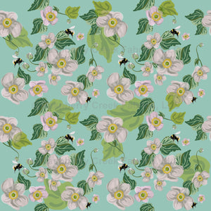 Pink and green on aqua blue. Bold floral with cute bees. Hand painted look.