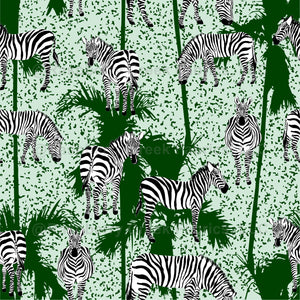 Animal Collection: Zebras in black and white stripes roam the African savannah for food under the green trees on a mint green background.