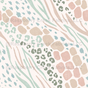 Animal print, spring, summer, pastel, cream, light pink, mint green, tan, girls, kids, leopard, giraffe, zebra, cheetah, hand drawn, kids, zoo