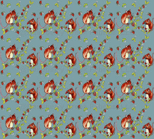Animals Collection: Sweet brown mice with white bellies and pink tail, ears, nibble on garden ripe red strawberries with green leaves on a slate blue background.