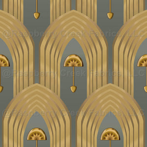 Inspired by Art Deco design, this artwork features gracefully overlapping gold nested arches with fan shaped sconce shapes in the open spaces that give a nod to the 1920's appreciation for ancient Egyptian motifs. The background is an ombre version of pewter green.