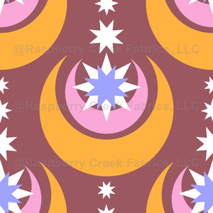 Art Deco moon and stars - pink, yellow and maroon wallpaper