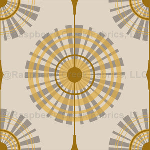Inspired by Art Deco design, this artwork features gold and brown circles superimposed on radiances on natural linen.
