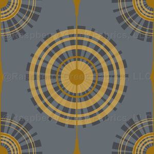 Inspired by Art Deco design, this artwork features gold and brown circles superimposed on radiances on Wall Street gray.