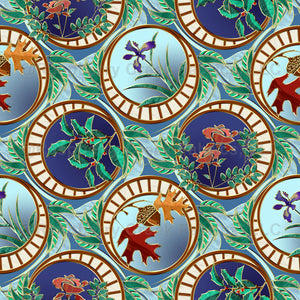This Art Nouveau design celebrates the seasons featuring circular nail paring moon frames filled with flowers and foliage that represent each of the four seasons: irises for spring, roses for summer, oak leaves and acorns for fall, and holly for winter.