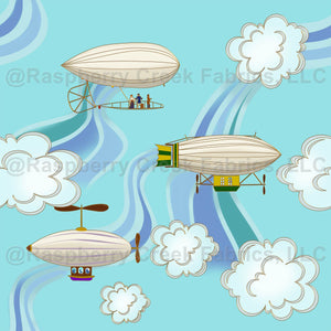 Beautiful steampunk dirigibles float through a cerulean blue sky attended by ornate puffs of clouds and swooshing breezes in an Art Nouveau style.