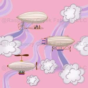 Beautiful steampunk dirigibles float through a pretty pink sky attended by ornate puffs of clouds and swooshing breezes in an Art Nouveau style.