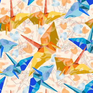 Asian-influenced folded paper yellow and blue origami cranes on a white background. Artist, Veronica Campos-Hallstrom, Club Creative Art.