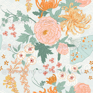 Celebrate the beauty of spring with this hand-drawn ink design inspired by Lunar New Year and traditional Asian florals. Featuring peonies, Japanese chrysanthemums, cherry blossoms, and delicate Asian fans, this pattern is enriched with intricate geometric motifs in a warm, organic palette of cream, peach, tan, and brown. Perfect for those who appreciate vintage elegance, cultural artistry, and nature-inspired aesthetics.