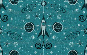 My original vector illustration of a re-imagined Damask, with vintage inspired rockets, planets, galaxies, starbursts and shooting stars, in textured monochromatic teal/ cadet blue. ©Christine Duffield 2020-21