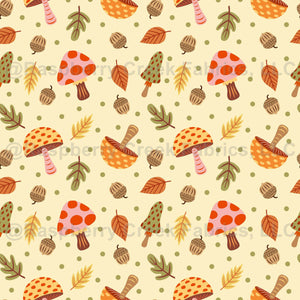 A pattern design featuring autumn acorns and mushrooms with decorative fall foliage on a yellow background.