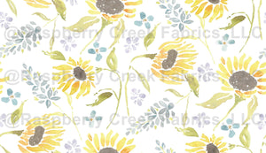 A traditionally painted watercolour autumn / Fall pattern with sunflowers and delphiniums. Perfect for girls clothing, accessories and more.