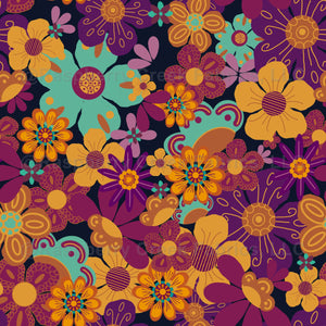 Stylized boho flowers in jewel tones and autumn colors scattered over a deep navy background. Yellow, mint green, burnt orange and deep purples pop in this eye-catching floral design.