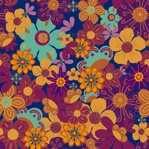 Stylized boho flowers in jewel tones and autumn colors scattered over a deep sapphire background. Yellow, mint green, burnt orange and deep purples pop in this eye-catching floral design.