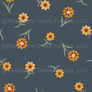 Autumn Burst Ditsy Floral Blue; Scattered Fall Flowers on Blue; Fall Floral on Blue Background; Rich Earth Tones; gold, red, and orange flowers on blue background