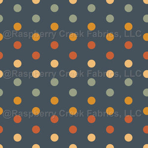 Autumn Burst Dot Blue; Rich Earth Tone Dots on Blue Background; Small multi-colored dots on blue background; Warm earth tones; gold, orange, and green dots.