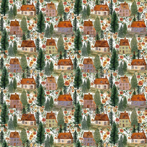 Autumn Cottages In The Woods with pine trees and fall flowers in the foliage