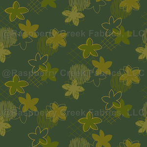 Abstract floral print with geometric accents, in shades of green, on a dark green background.