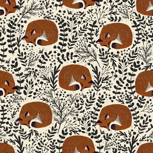 Cute red foxes sleeping amongst black leaves over a cream background. Perfect as fall decor.